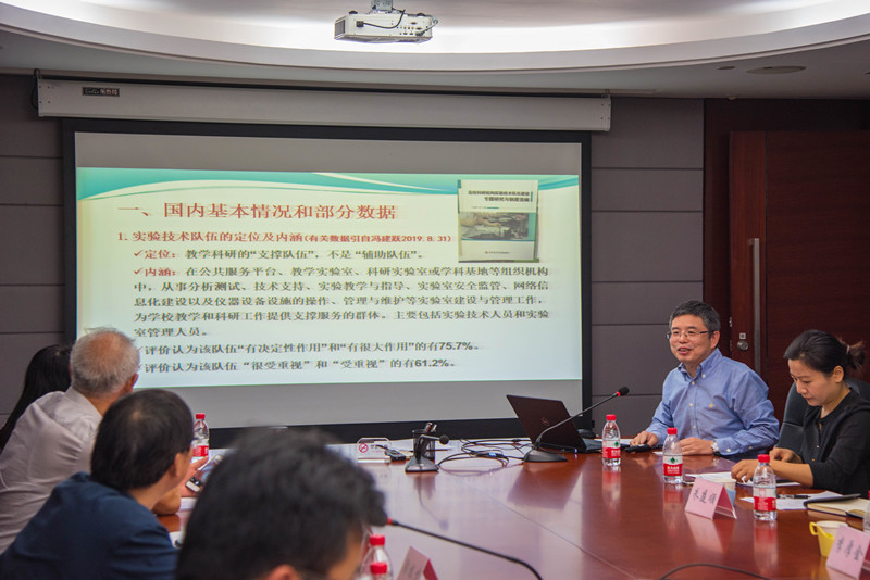 接着,李厚金副教授就中心近年来的工作向大家做了详细汇报,内容包括实验室的硬件建设、课程建设、师资建设、实验室管理、实验室安全、教学改革与研究、学生课外创新实验项目、竞赛培训、交流和示范等建设成效一一做了介绍,对目前正在筹划建设的新大楼实验室、国家级虚拟仿真教学实验项目、慕课、实验“金课”、基础学科拔尖学生培养计划2.0新课程体系等做了汇报并征询了专家们的意见。朱庭顺教授随后介绍了学院公共仪器平台的管理现状与未来发展,并对建设过程中遇到的系列问题与专家们进行了交流,如仪器维护管理人才要求日益提升与晋升困难的矛盾、科学发展与技术性人才紧缺的矛盾、实验数据保存和验真、仪器管理服务如何与人才培养目标相结合等。