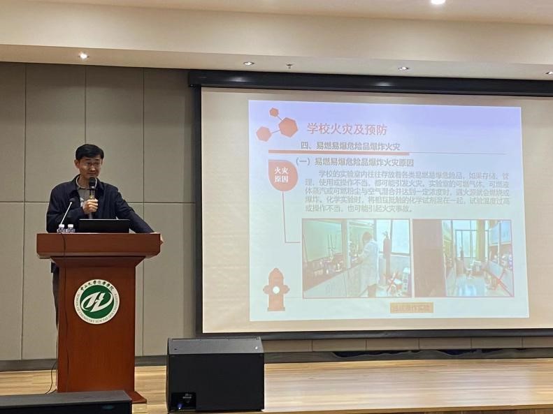 永利集团3044noc登录入口保卫处李朝柱老师为我院师生带来消防安全知识讲座,并强调增强居安思危的意识并重视日常实验室安全检查工作的必要性,以及了解实验室内灭火设施和配置以及掌握易燃易爆化学品性质以利于采取相应灭火措施的重要性,重点介绍了实验室中易燃易爆危险品爆炸的预防措施。
