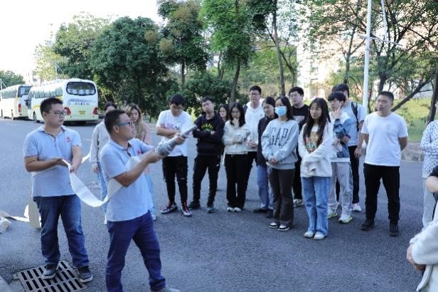参与活动的师生认真仔细地学习消防器材使用方法并积极参与实操演练