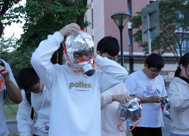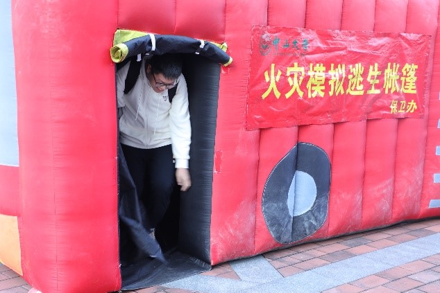 讲座结束后,我院在化学材料综合楼北侧实施现场教学与演练。在保卫处工作人员指导下,在场师生学习了灭火器、防毒面具、消防栓等应急器材的使用,体验模拟逃生帐篷。
