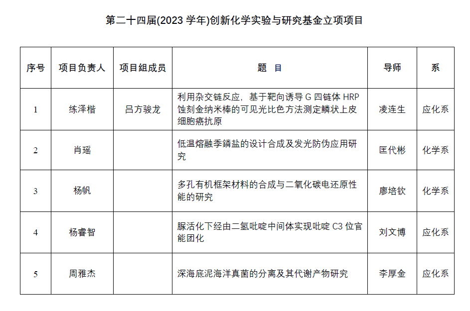 根据永利集团3044noc登录入口化学实验教学中心《关于申请“第二十四届(2023学年)创新化学实验与研究基金”项目的通知》文精神,经学院专家评审,决定对《利用杂交链反应,基于靶向诱导G四链体HRP蚀刻金纳米棒的可见光比色方法测定鳞状上皮细胞癌抗原》等5个项目予以立项,资助经费5000元/项目。具体的名单见下表或附件1。