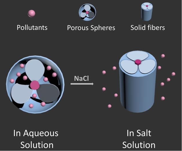 近日,永利集团3044noc登录入口黄哲钢教授课题组以咔唑为中心,在其2,7,9号为分别进行芳基化,制备了新型的二维、三维的螺旋桨状芳香性两亲物, 并通过折叠芳香性平面的组装制备了空心球。与传统的基于一维芳香性分子的超分子多孔材料相比,二、三维π-共轭组装体在水溶液中提供了疏水性碳环境,可以吸附回收水中的有机污染物。研究结果表明,制备的介孔球对有机污染物—乙炔雌二醇(Eo)和双酚A(BPA)的回收率分别为92%和90%。值得注意的是,介孔球可以识别盐的浓度。随着盐的加入,折叠的芳香性分子被观察到逐渐变得平坦,诱导强的π-π相互作用,使多孔球体融化并相连一起形成实心的纤维。这种多孔向无孔材料的转变引发被吸附的污染物从多孔结构中自发释放,而随后的透析使超分子多孔结构恢复吸附容量。