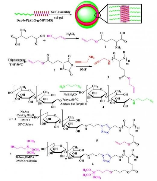 永利集团3044noc登录入口材料科学与工程学院张黎明教授课题组对含三甲氧基硅烷侧基的两亲性葡聚糖/聚-L-谷氨酸酯嵌段聚合物衍生物的合成、核交联有机/机杂化纳米胶束的制备以及药物释放开展了以下研究工作:首先利用“叠氮-炔基”点击反应合成葡聚糖/聚(γ-丙烯基-L-谷氨酸酯)嵌段聚合物 (Dex-b-PALG),后使用“巯基-乙烯基”点击反应将(3-巯基丙基)三甲氧基硅烷 [(3-Mercaptopropyl)trimethoxysilane (MPTMS)]引入聚(γ-丙烯基-L-谷氨酸酯)链段上制得含三甲氧基硅烷侧基的两亲性葡聚糖/聚-L-谷氨酸酯嵌段聚合物衍生物[Dex-b-P(ALG-g-MPTMS)] (图 1),后经过自组装与水解交联作用,得到核交联的有机/机杂化纳米胶束。用光散射、透射电镜等分析测试手段对该类杂化纳米胶束进行表征;研究了不同的制备条件对所得杂化纳米胶束粒径与形貌的影响,最后通过药物释放实验与体外细胞毒性试验研究了杂化纳米胶束作为药物载体的应用前景。