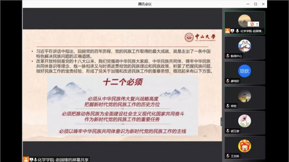 随后,谭海燕副书记传达了中央民族工作会议精神,希望全体支部委员们能继续深入了解“十二个必须”,以及民族团结在我们新的工作、新的百年奋斗目标中的重要地位。最后,她结合本月学习要点布置相关工作,特别强调各党支部要认真做好中央巡视整改反馈工作,继续做好“党史学习教育”工作,扎实开展纪律教育学习月活动等。学习例会最后,开展了纪律教育,与会人员结合党史学习教育内容,共同观看红军中开展纪律教育的视频,令支委们进一步明确纪律教育的重要性,今年学习的重点内容和方向。