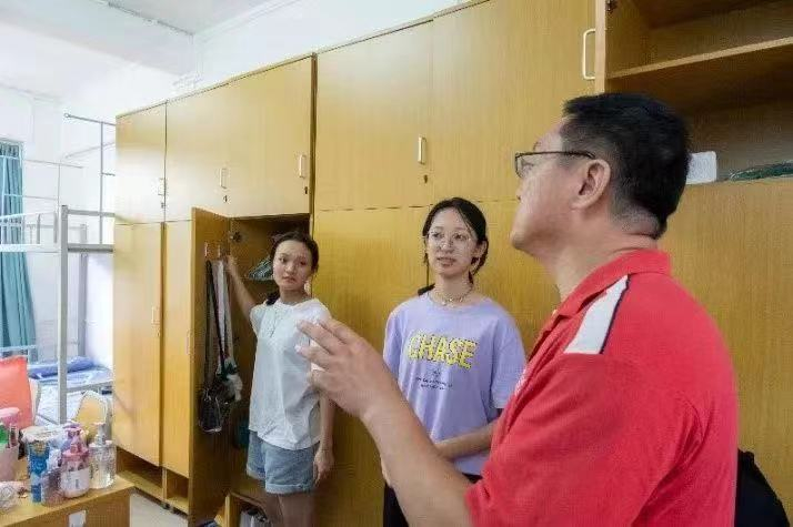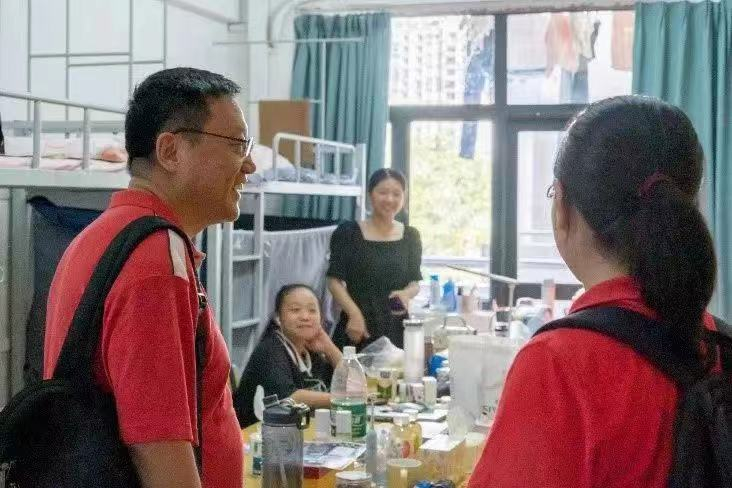 在同学们入住南校园宿舍后,冯双书记和谭海燕副书记随即前往宿舍楼看望同学们。冯双书记对同学们回到南校园表示欢迎,并亲切询问新生的生活学习和军训情况,同时结合宿舍特点,提醒新生要注意宿舍用电安全,做到防患于未然,平安开启自己在南校园的大学生活。