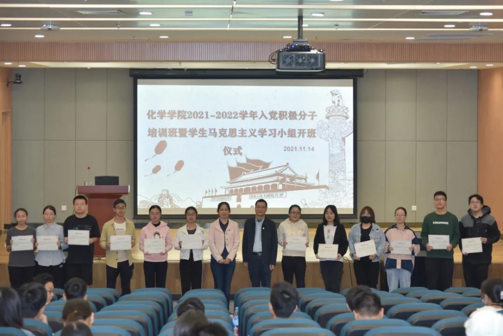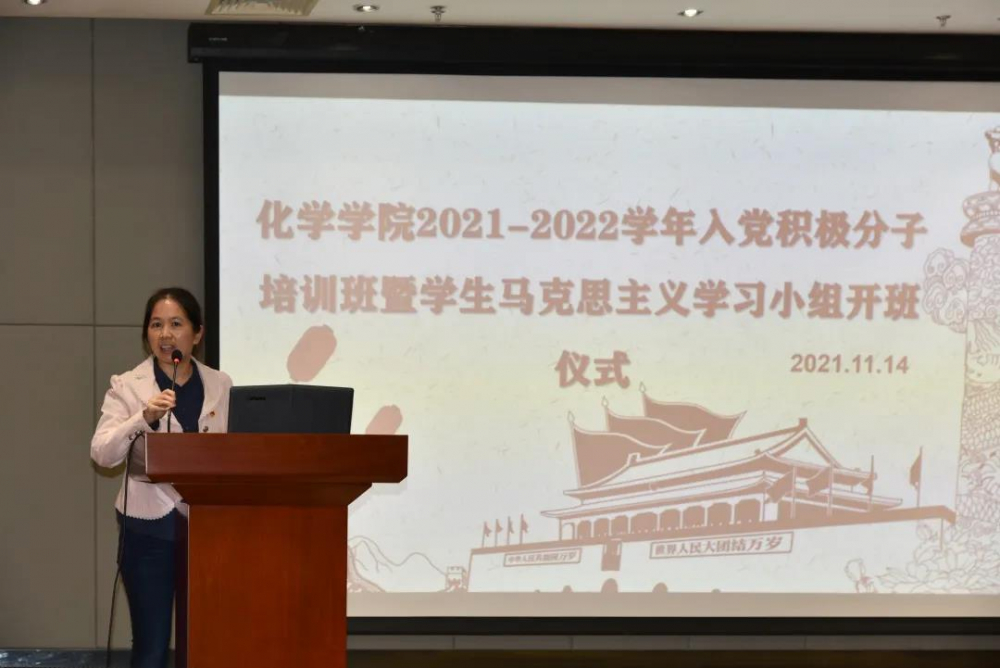 为落实学校团委关于院级党章学习班建设的工作,同时进一步发挥马克思主义学习小组引领学生思想教育作用,永利集团3044noc登录入口于11月14日下午在东校园化学材料楼B303举办2021-2022学年马克思主义学习小组暨党章学习班开班仪式。党史专题报告专家朱志辉,学院党委副书记谭海燕,团委书记王帅,团委副书记王雪燕、刘健阳,研究生指导员代表,入党积极分子,研究生党支部和本科生党支部各马克思主义学习小组指导员代表等约150人参加了本次活动。
