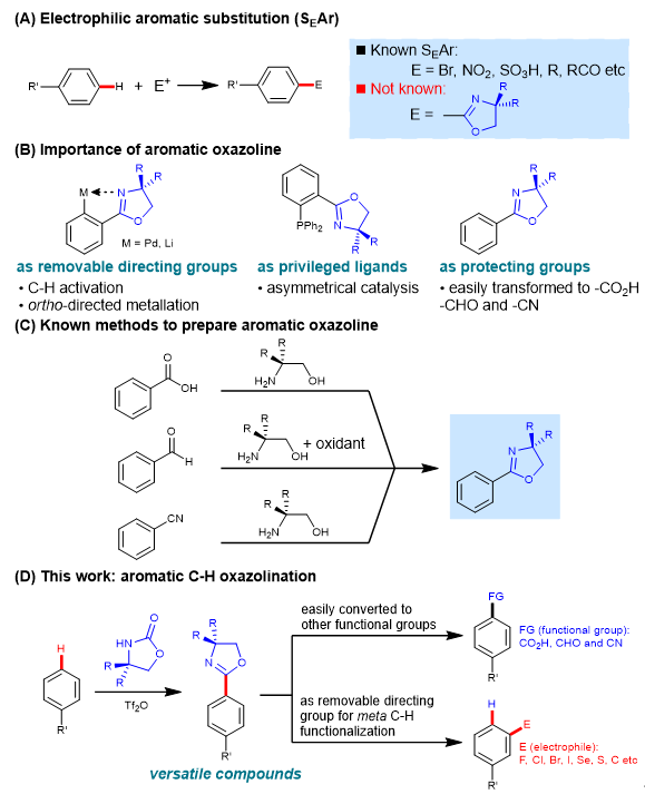 亲电芳香取代反应(SEAr)是有机化学中的重要转化,例如常见的亲电芳香溴化、硝化以及傅克烷基化和酰基化反应。发展一种强大且实用的亲电芳香取代反应以实现芳香C-H键的多样官能团化受到了人们广泛的关注。恶唑啉在有机合成中具有很高的合成价值: 1)它可以作为有力且可移除的导向基团,用于过渡金属催化的C-H活化和邻位导向金属化反应;2)它存在于很多配体中,例如众所周知的PHOX型配体;3)它在简单温和的条件下能转化为羧酸、醛和腈。目前主要是通过羧酸、醛以及腈与不同的1,2-氨基醇之间的缩合来制备恶唑啉。尽管这些方法用途广泛,但是往往需要底物上具有预官能团,因此发展一种直接通过C-H键的官能团化一步构建恶唑啉的方法具有十分重要的意义。近日,永利集团3044noc登录入口永利集团3044noc登录入口刘文博课题组报道了一种芳香C-H键恶唑啉化的方法(图1),相关研究成果发表在Precision Chemistry上。