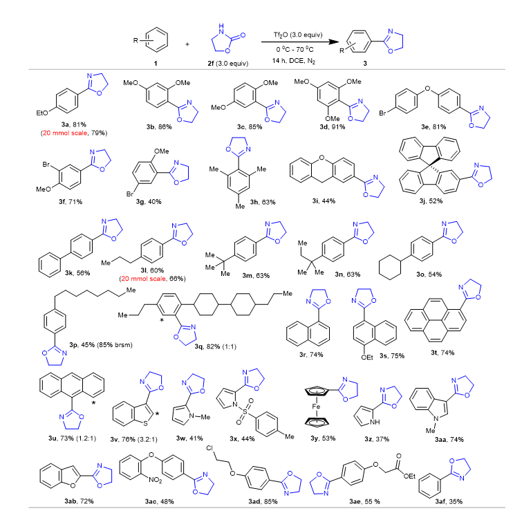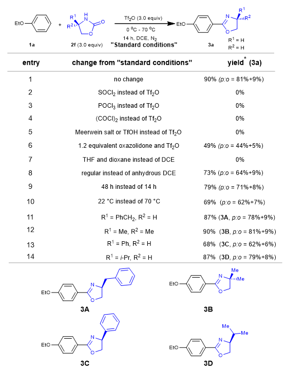 首先作者用苯乙醚1a和2-唑烷酮2f作为模板底物,对活化试剂的种类和当量,反应的溶剂,温度和恶唑烷酮的种类进行了筛选(图2)。实验结果表明,以3当量的三氟甲磺酸酐作为添加剂,DCE为溶剂,在70 ℃下反应,可使目标产物产率达到最佳。