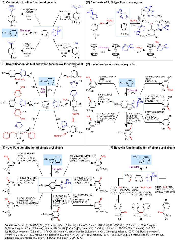 为了说明该方法的合成价值,作者制备了很多其它方法很难制备的官能团化芳烃。主要包括(a)将恶唑啉直接转化成羧酸,醛,腈和恶唑;(b)直接从芳烃制备PHOX-型配体;(c)恶唑啉导向的邻位碳氢键活化反应;(d)乙氧基苯的间位硒化,氯化,溴化,氘化,甲基化,氟化和硫化等官能团化反应; (e)正庚苯的间位硒化,氯化,溴化,氘化,甲基化,氟化和硫化等官能团化反应;(f)正庚苯的苄基位甲基化,氘化和二聚。这些例子清晰地表明,该亲电芳香恶唑啉化可以用于合成其它方法不能制备的多样性芳香化合物。