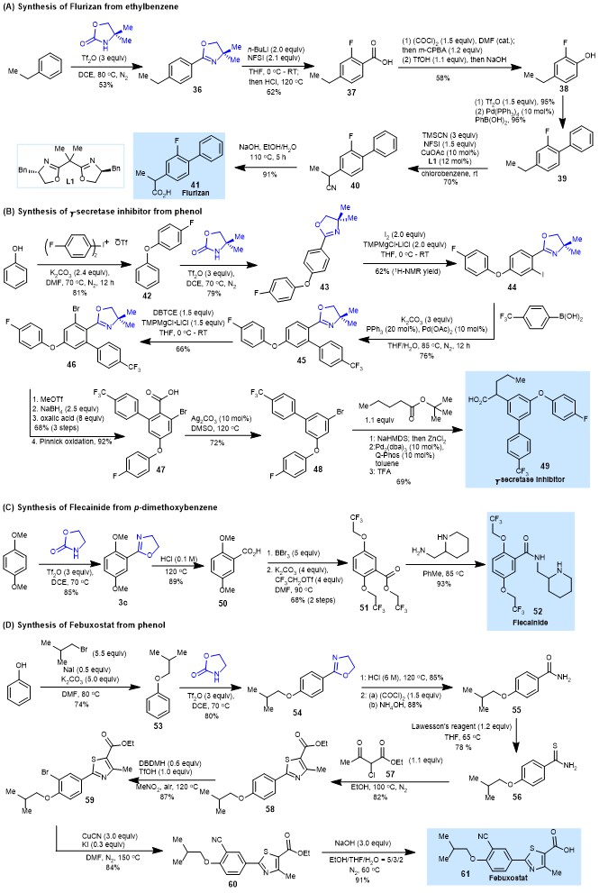 除了在芳香族化合物的多样化方面的应用外,作者还利用该芳香恶唑啉化反应作为关键步骤从简单的芳烃作为起始原料合成了氟比洛芬,γ-分泌酶抑制剂,氟卡尼和非布索坦四个药物分子(图6)。