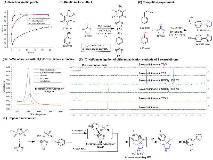 最后作者还对反应机理进行了研究并且提出了反应可能的机理(图7),2-唑烷酮在三氟甲磺酸酐的活化下形成亚胺中间体并被富电子芳烃亲核加成形成中间体65,通过KIE效应证明该过程芳香碳杂化方式经历了sp2到sp3的转变,65芳构化形成热力学不稳定的四面体中间体66并转化成最终的恶唑啉产物。