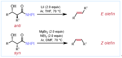 烯烃是天然产物、药物、农药和香料等高价值分子的重要砌块和前驱体,其选择性合成在有机合成中至关重要。目前通过消除过程合成烯烃的方法主要包括 Chugaev 消去, Burgess 消去法, Sharpless-Grieco 消去和过渡金属促进消去等。但是这些方法仍然存在一些缺点,例如温度过高、对水氧敏感或者试剂有毒、价格昂贵等。更重要的是,这些方法通常会产生不可分离的 E/Z 异构体混合物。即使是得以广泛应用的 Wittig 反应,依然会不可避免地会产生两种异构体。因此,制备高选择性的 E/Z 异构体的方法具有较大价值,但同时也具有较大的挑战性。