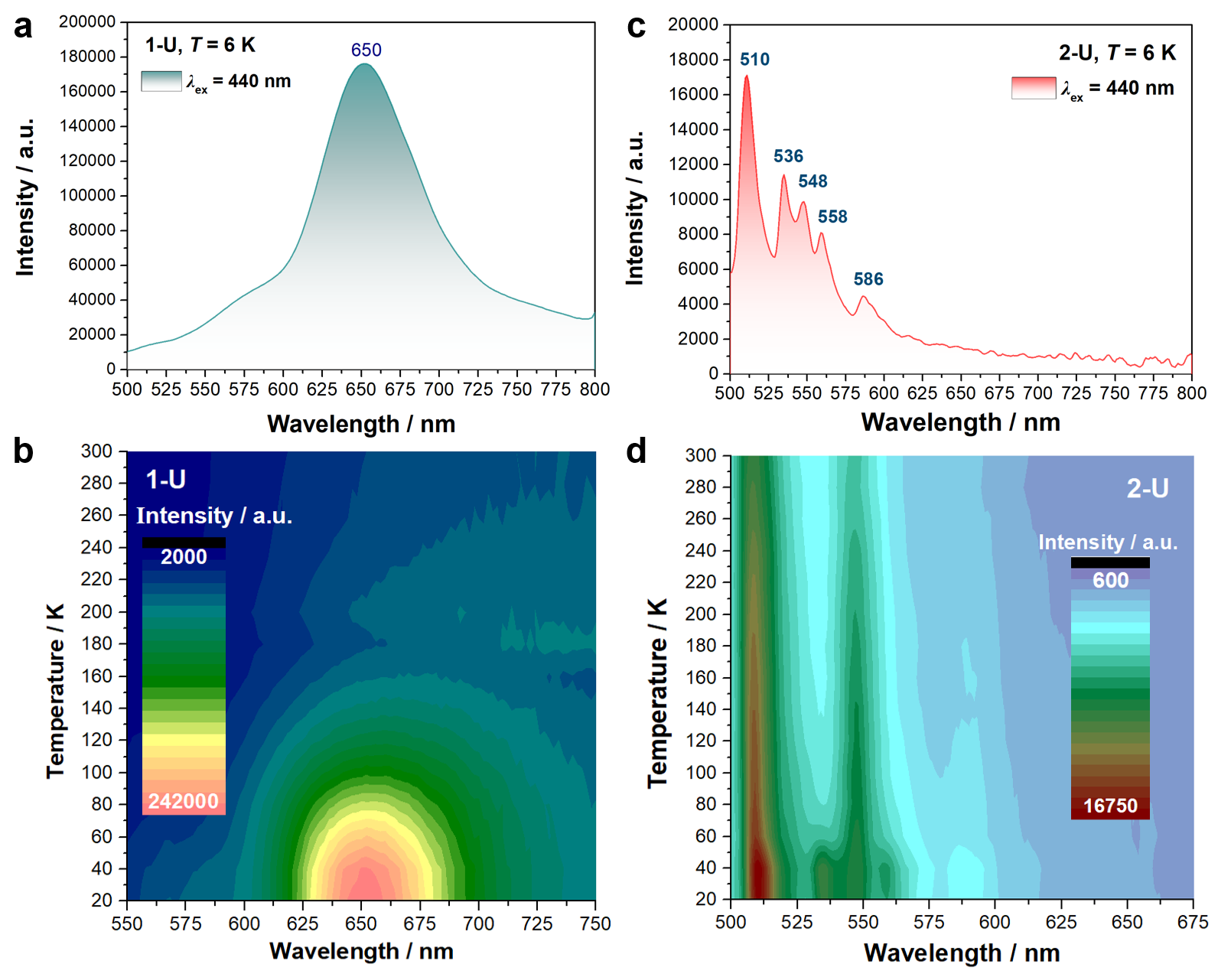图2. 六价铀酰前驱体 (a) 和目标五价铀酰配合物 (c) 的稳态低温精细荧光光谱及其变温荧光光谱 (b, d)。